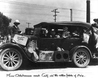 Migrant workers, 1935. Annotation reads: "More Oklahomans reach California via the cotton fields of Arizona." Paul Taylor and Dorothea Lange, Migration of Draught Refugees to California, California State Emergency Relief Administration, April 1935, p. 12. Prints and Photographs Division, Library of Congress (89) LOT 897. Source: http://www.loc.gov/exhibits/wcf/images/wcf089.jpg |