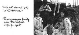 | Migrant workers, 1935. Annotation reads: " 'We got blowed out in Oklahoma' / Sharecroppers family near Bakersfield" |