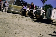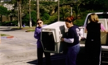 | Volunteers preparing to release several sea lions: unloading the cages. |