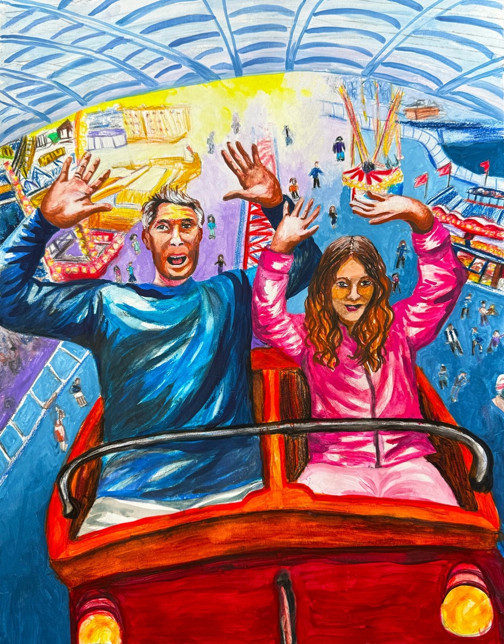 In my artwork, I have painted my dad and I on a roller coaster, as it bonds us. Every time I want to go to an amusement park, he constantly tries his best to take me there. His efforts of being there for me teach me the values of being supportive and kind. I chose to paint my father and I because we always go to roller coasters together and share unforgettable lasting memories together. This is why my father is my role model.