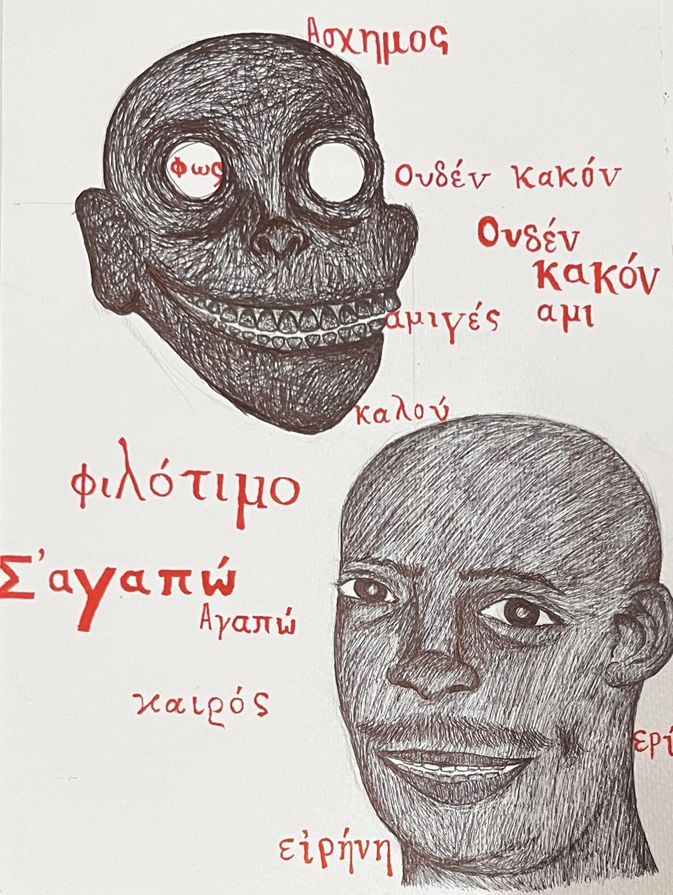 For my hero project I chose to draw a portrait of my father using black pen and fine liners. On the top left corner I drew a monster. I chose to draw my father who has passed away next to a monster to depict how I have viewed him for so long before his death and essentially it emphasizes the title ‘Crowned by Death’. For the longest time because of the stories my mom told me after her divorce from my father ,I saw him as a horrible person, one undeserving of love, at least my love. The monster represents the villain I saw my father as the portrait of him represents how I began seeing him after his death, after finding out about all the sacrifices and silent acts of love he’s performed. I chose this title to bring to life my perception on how my father’s acts of heroism and love only came to light when he passed away, and how it took death for me to see him as the hero he’s always been. The words in red are in Greek verbalize his kindness, the monster I saw him as and the overall meaning of the artwork. I have written the words in Greek to add to the mystery of my dad’s heroism hidden within my flawed perception of him.