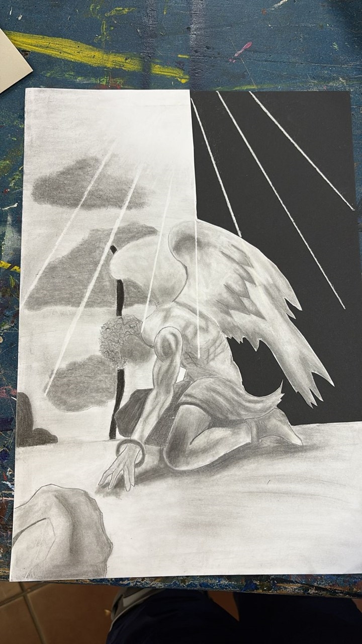 This artwork illustrates a powerful moment where Samson, my hero, kneels down before the heavens in a state of surrender, strength, and spiritual connection. On the left side, the drawing is filled with light, soft clouds that represent the purity and peace of heaven. This brightness symbolizes God’s presence shining down onto Samson, reminding us of hope, guidance, and divine protection.