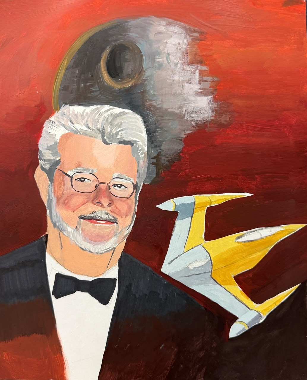 Reference public image of George Lucas, found on "Inkl.com." Deathstar imagery and starship trooper vehicle reference from Star Wars Franchise.