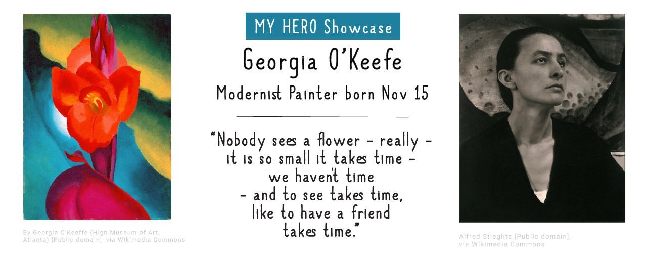 Learn about the independent and vibrant life of 20th century modernist painter Georgia O'Keefe with our multimedia showcase of hero content. O'Keeffe initially created her art in New York City where she lived with husband Alfred Stieglitz but later moved to northern New Mexico where she fell in love with the American West which is reflected in her later paintings.