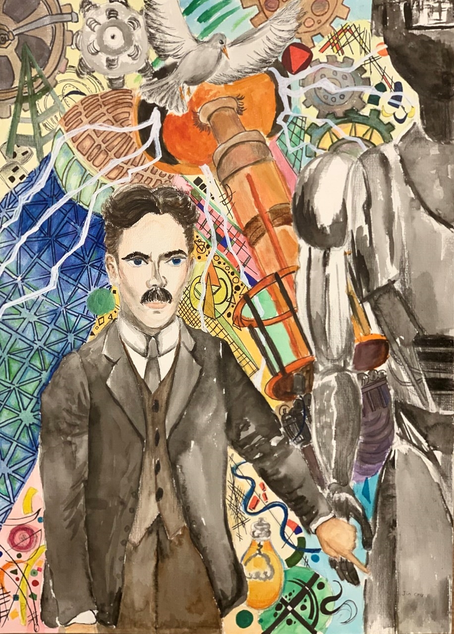 When I saw the picture of Tesla holding hands with a robot 100 years ago, I was shocked! Curiosity made me learn more about Tesla's story. I decided to draw his portrait and add his research and inventions, some scientific research equipment, etc. to the picture. The portrait and the robot are the main body of the picture. I use watercolor to express them, and mainly black and white and gray, representing the long history of time, as well as the rationality and seriousness of science. The launch tower and scientific experimental equipment are used as the background, and the main body is set off by color contrast, expressing the creativity and infinite possibilities of science. I added the artistic language of abstract artist Kandinsky. Irregular color blocks and lines make the picture more dynamic, and abstract symbols create a sense of mystery and exploration of the unknown. The pigeon is Tesla's favorite, and it also represents world peace. Overall, the contrast between black and white and color makes the picture rich, rhythmic and layered. What I want to express in my creation is that creativity is the greatest ability of mankind, bringing scientific and technological progress and social development. Creativity comes not only from scientists, but also from artists. It is a display of human wisdom. I pay tribute to these great scientists and artists.