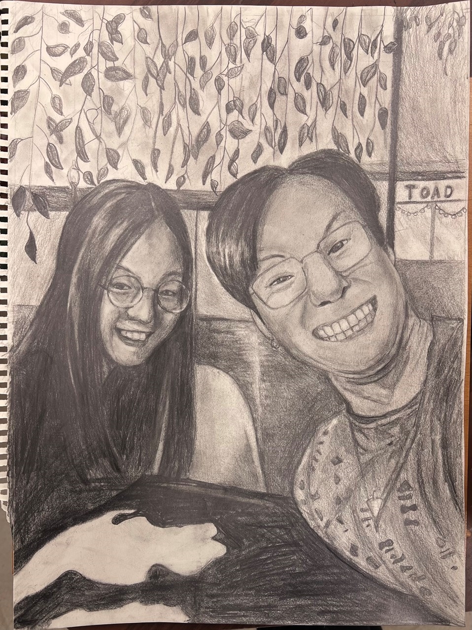 Thank you to my dad for raising me and being with me through the good and the bad times. I decided to draw a favorite memory of mine with my father. You can see from our facial expressions and our distance of how important our relationship is. I am very thankful for having raised me and continuing to support me in my artistic journey.