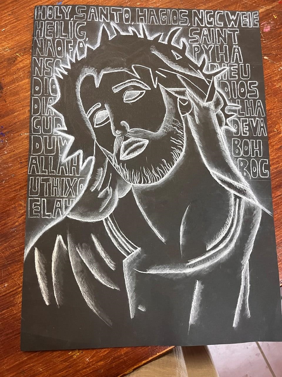 In my artwork titled Christ is the Hero, I used white chalk on black paper to create a striking contrast that symbolizes light overcoming darkness. The choice of white on black represents purity, hope, and salvation shining through sin, suffering, and despair. By working with chalk, a fragile and easily erasable medium, I wanted to express the idea that life is temporary and imperfect, yet faith in Christ brings lasting strength and redemption.