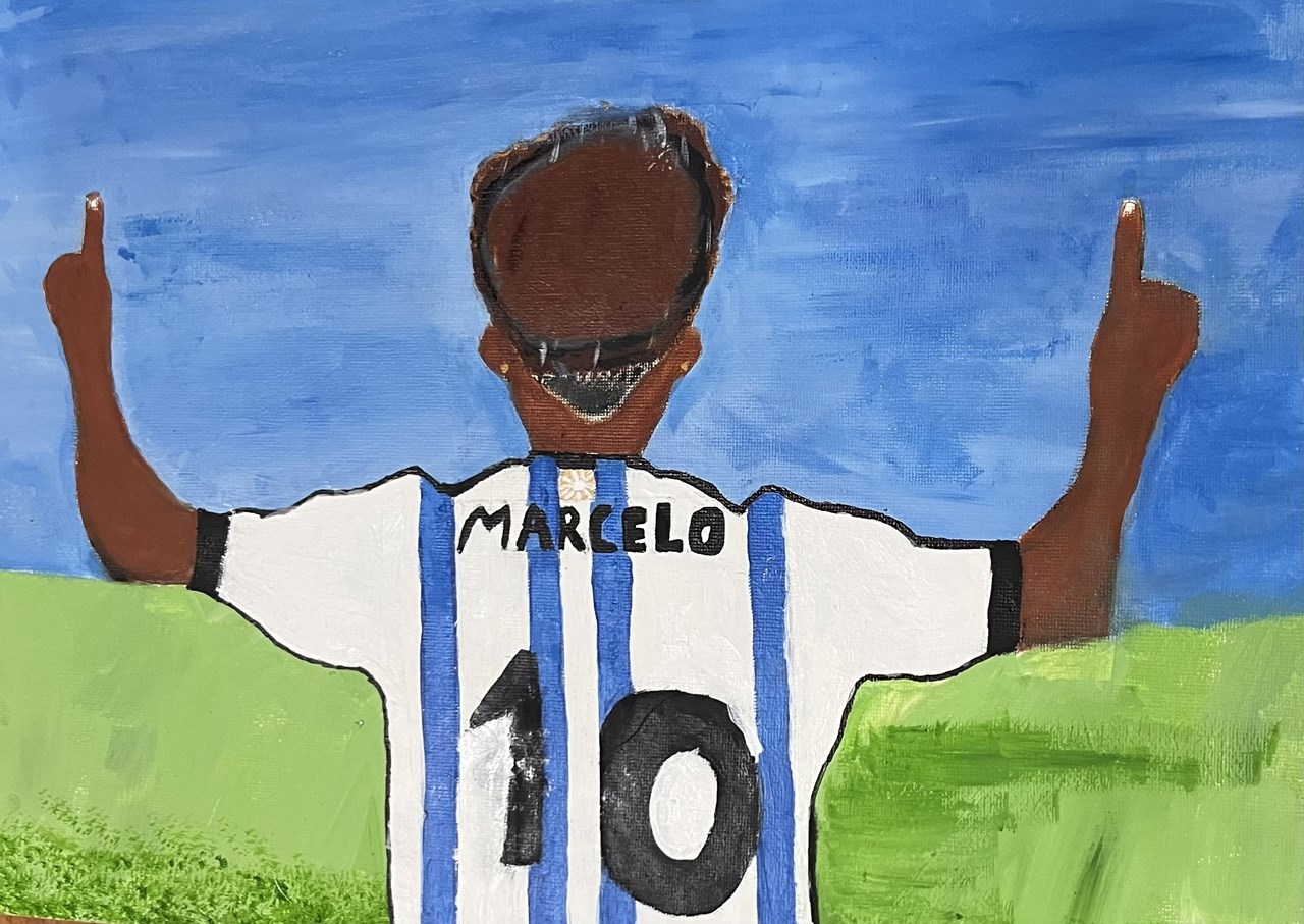 My dad inspires me, supports me, and makes me feel safe. He always pushes me to do my best and knows how to make me laugh. By painting him as an athlete, I wanted to show that he is a leader in my life, a role model, and someone I look up to every day. The artwork shows how much I appreciate all the ways he has helped shape who I am.