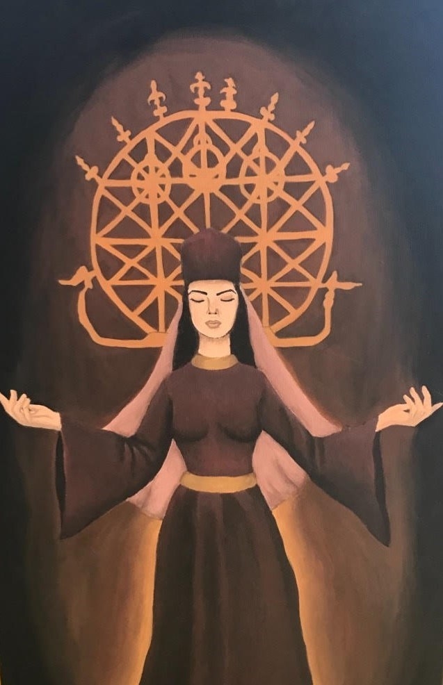 The powerful queen of the Hittite Empire, which ruled over what is now Turkey, Puduhepa, was a female hero who championed peace and diplomacy. The enlarged cuneiform replica of the Treaty of Kadesh, inspired by Akkadian clay tablets, is displayed as a symbol of peace on the wall of the United Nations Headquarters in New York, demonstrating the document's universal value. However, very few people know that behind this historic peace text lies Puduhepa's vision and diplomatic acumen. She is an unforgettable hero who inspired women through her leadership. In my artwork, created with acrylic paint on canvas, I depicted the Hittite queen Puduhepa.