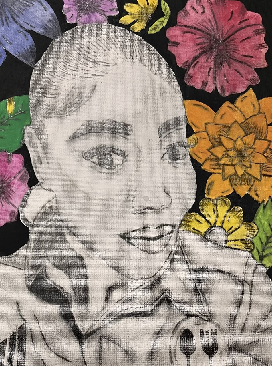 My artwork is a pencil portrait of my mother I chose to draw her because she is the person whose strength, love, and resilience have shaped who I am. I used graphite to capture her facial features in a soft, realistic style, representing her calm and steady presence in my life. Behind her, I added brightly coloured flowers to symbolise her personality vibrant, warm, and full of life. Each flower represents a different aspect of her character: her kindness, her joy, her patience, and her ability to help others grow. The contrast between the black and white portrait and the colourful background also reflects how she brings colour and light into every space she enters. This artwork is my way of honouring her and showing that, to me, my mother is not just a parent, but my hero.