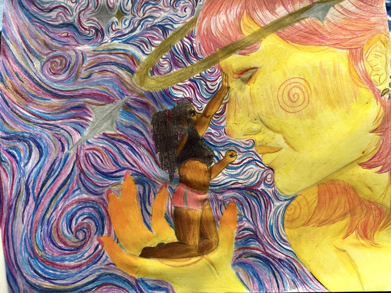 I wanted to depict my best friend, who is my absolute rock, in my eyes. I wanted to show how she literally has me in the palm of her hand, and how she's basically a goddess to me.
