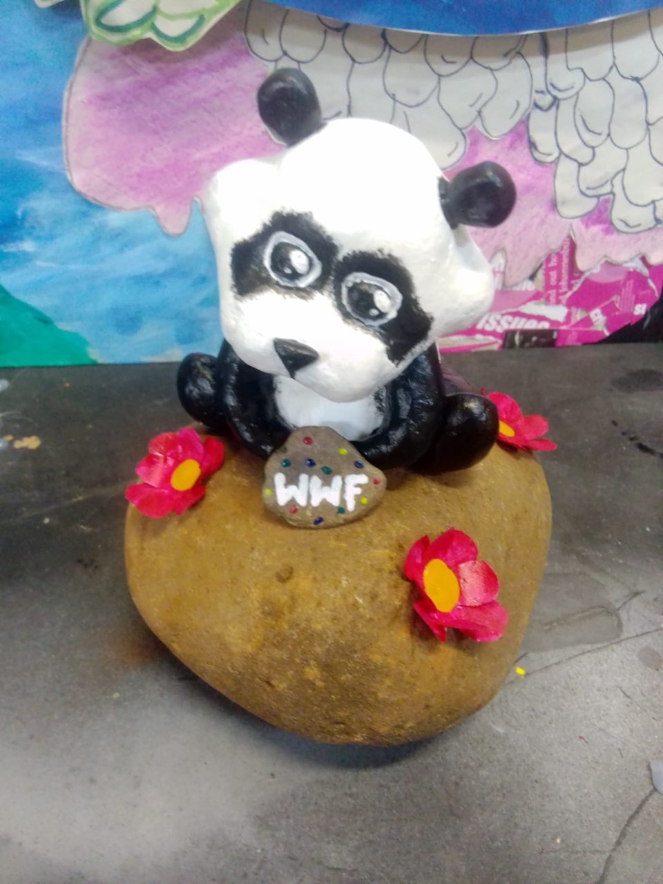 This is a sculpture made mainly of air-dry clay and the side parts of paper, paint, and even stone. The sculpture is of the foundation, WWF, which stands for World Wide Fund for Nature or World Wildlife Fund. The reason I chose them is that I have a big passion for nature and animals in particular. What they have been doing over the years by bringing awareness to the globe about species that are fighting to survive, and we didn’t even know, and even taking it into their hands and raising funds and working with people to make these creatures' survival happen. The reason I chose the flowers to be red is that it is such a bright and bold colour. It can change in meaning depending on your own feelings or how you see the artwork. It can go from anger to a form of desperation or even a passion that isn’t anything sad or dark.