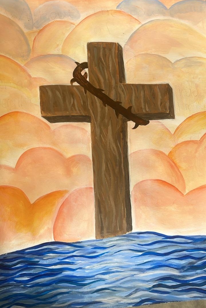 My artwork depicts a wooden cross rising from the ocean, crowned with thorns, with warm sunset clouds glowing in the background. I created this piece to explore the idea of faith as a source of strength, guidance, and renewal. The ocean represents the challenges, uncertainty, and overwhelming moments we face in life, while the cross emerging from the water symbolizes hope rising above difficulty. The crown of thorns is a reminder of sacrifice, resilience, and unconditional love.